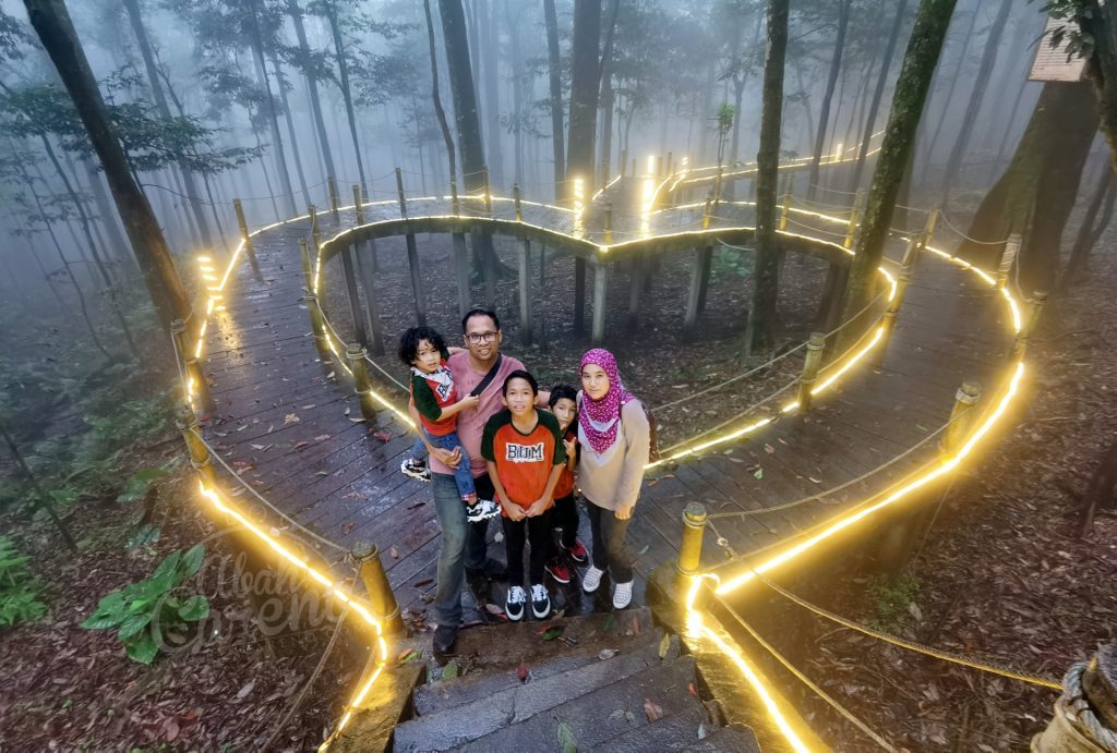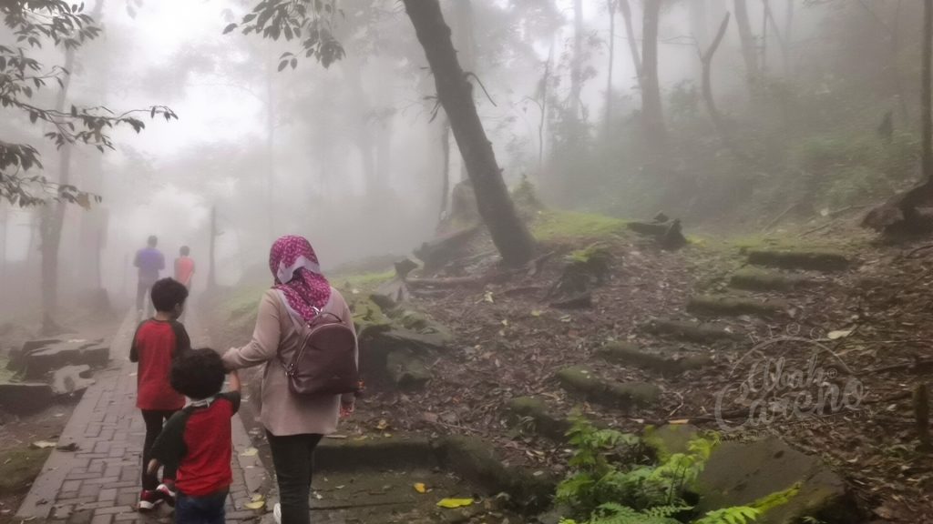 Suasana kabus tebal buatkan persekitaran terasa sungguh nyaman. Ni pengalaman pertama kami berjalan dalam kabus tebal yang macam ni kat dalam hutan. Bukan aku jer teruja, anak-anak pun seronok sebab bagi budak-budak bandar, suasana macam ni memang sesuatu yang baru dan unik.