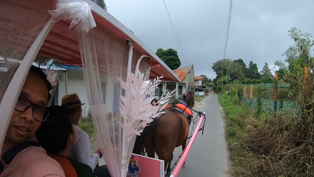 Selain shopping, kat sini jugak korang boleh merasa naik kereta kuda. Harga untuk naik kereta kuda ni Rp50,000 atau lebih kurang RM15 untuk sekeluarga. Die akan bawak pusing pekan Berastagi tu dan lalu kat dalam kawasan kampung, lebih kurang 10 minit naik kuda ni.